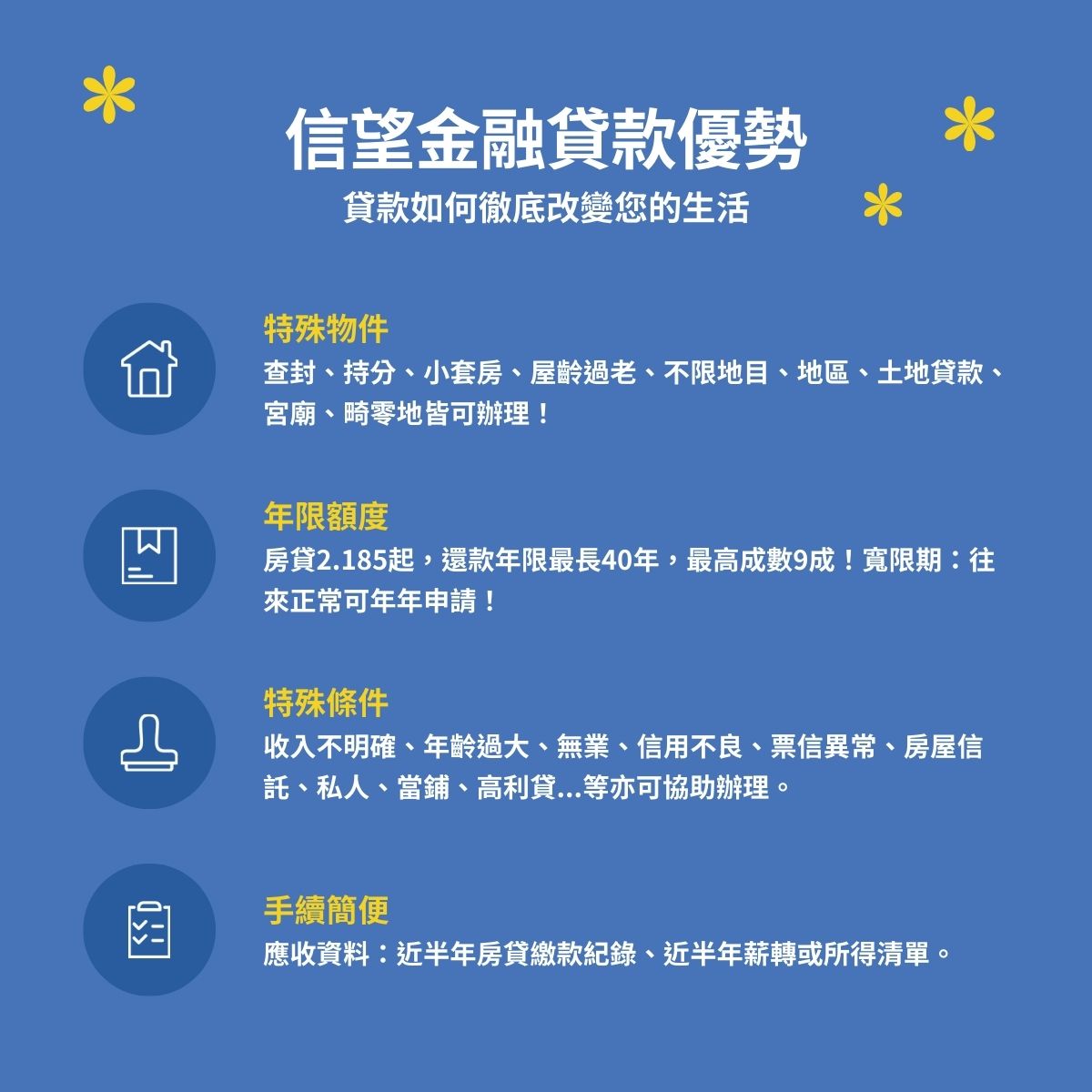 信望金融-房屋貸款 特殊物件:查封、持分、小套房、屋齡過老、不限地目、地區、土地貸款、宮廟、畸零地皆可辦理! 年限額度:房貸2.185起,還款年限最長40年,最高成數9成!寬限期:往來正常可年年申請! 特殊條件:收入不明確、年齡過大、無業、信用不良、票信異常、房屋信託、私人、當鋪、高利貸...等亦可協助辦理。​ 手續簡便:應收資料:近半年房貸繳款紀錄、近半年薪轉或所得清單。​